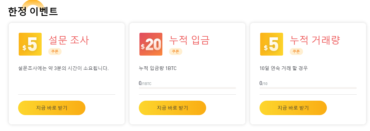 한정이벤트도 있습니다. 설문조사 3분짜리인데, 이것도 하면 금방 5달러 받아가겠쬬? 20달러 누적입금 이벤트랑 5달러 누적 거래량 이벤트는 마진거래를 하다보면 자연스럽게 받게 되시겠네요.