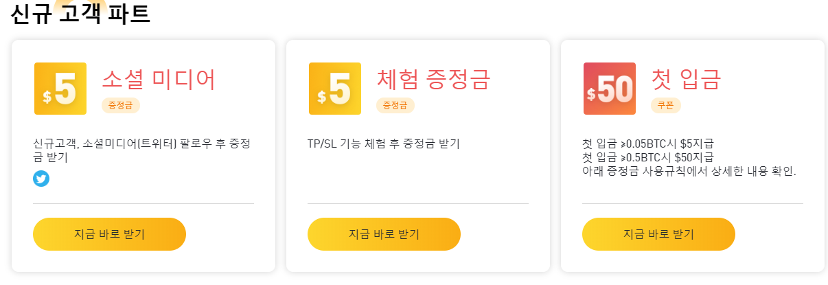 다음으로 첫입금 이벤트인데요. 첫입금 이벤트는 입금수량에 따라 혜택이 다르네요. 0.05 btc 이상일시 5달러를 지급하고, 0.5btc 이상일때는 50달러를 지급합니다.